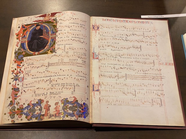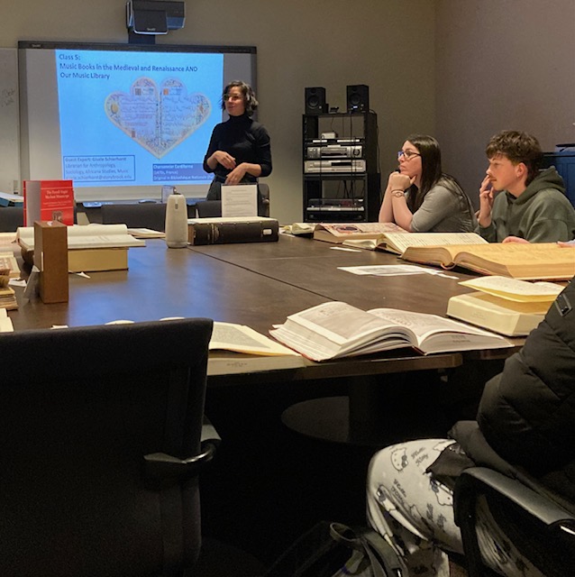 Music majors in Professor Erika Honisch’s MUS 350 class (Western Classical Music Before 1750) enjoyed a visit to the Music Library’s Seminar Room to examine a variety of manuscript facsimiles. Gisele Schierhorst, Head of the Music Library, presented numerous limited edition facsimiles representing the Medieval, Renaissance, Romantic and Contemporary periods of music. The facsimiles are exact reproductions of the original sources, including music, text, images, even covers and imperfections of the papers’ leaves. Students listened to a cd performance of songs from the Cordiforme codex, a heart-shaped manuscript of 15th century love songs. Mrs. Schierhorst reviewed the Music Library’s acquisition of several facsimiles. Prof. Honisch discussed the value of such primary sources and how they have enlightened historians and performers for centuries.